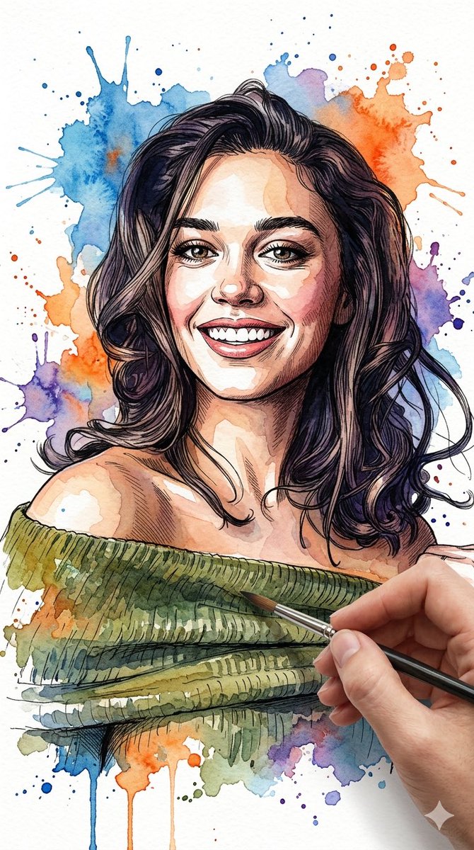 Create a vibrant and artistic watercolor painting of a smiling person, using the uploaded photo as the facial reference without altering their facial features or appearance. The background is clean white, filled with dynamic and expressive watercolor paint splashes in {argument name="splash colors" default="blue, orange, and purple"} spreading organically across the scene. In the foreground, a realistic human hand holds a paintbrush as if actively painting the sleeve of the man's hoodie, creating the illusion that the portrait is being painted at that exact moment. The visual style combines detailed ink line art with loose watercolor textures, including paint drips, fine splatters, soft pigment diffusion, watercolor blooming effects, and natural paper texture. The image features strong contrast, an expressive and dynamic artistic look, a clear hand-painted aesthetic, centered composition, soft lighting, high level of detail, and a modern illustration style. Vertical aspect 9:16.Related Nano Banana Pro Prompts