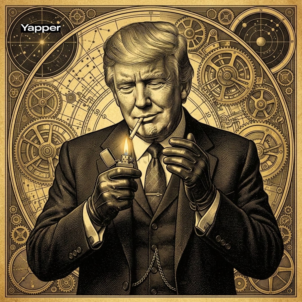 Nano Banana Pro AI image example generated with this reusable CDance AI prompt: A prompt for generating an ultra-detailed vintage engraved illustration of Donald Trump in a dark suit, lighting a cigarette. The style is…