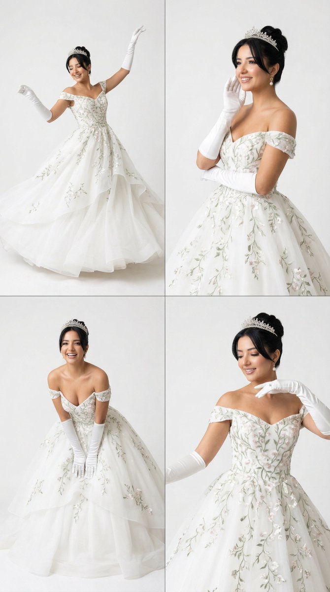 "notes": "Create a photoreal 2x2 editorial grid featuring one elegant adult woman across four panels. She should have the same facial identity in all four panels and appear like a modern princess in a grand white gown with a tiara and long white opera gloves. The dress should be a luxurious off-shoulder or strapless white ball gown with delicate floral embroidery, soft green vine-like detailing, couture volume, and regal movement. The mood should feel joyful, graceful, romantic, and refined, inspired by a royal ballroom dance moment. Every panel should show a different dance-related pose or candid movement, but the woman must remain the same. The background in all four panels must be bright white or very pale ivory, clean and elegant, with no dark ballroom background. Keep the result airy, luminous, aristocratic, and timeless."