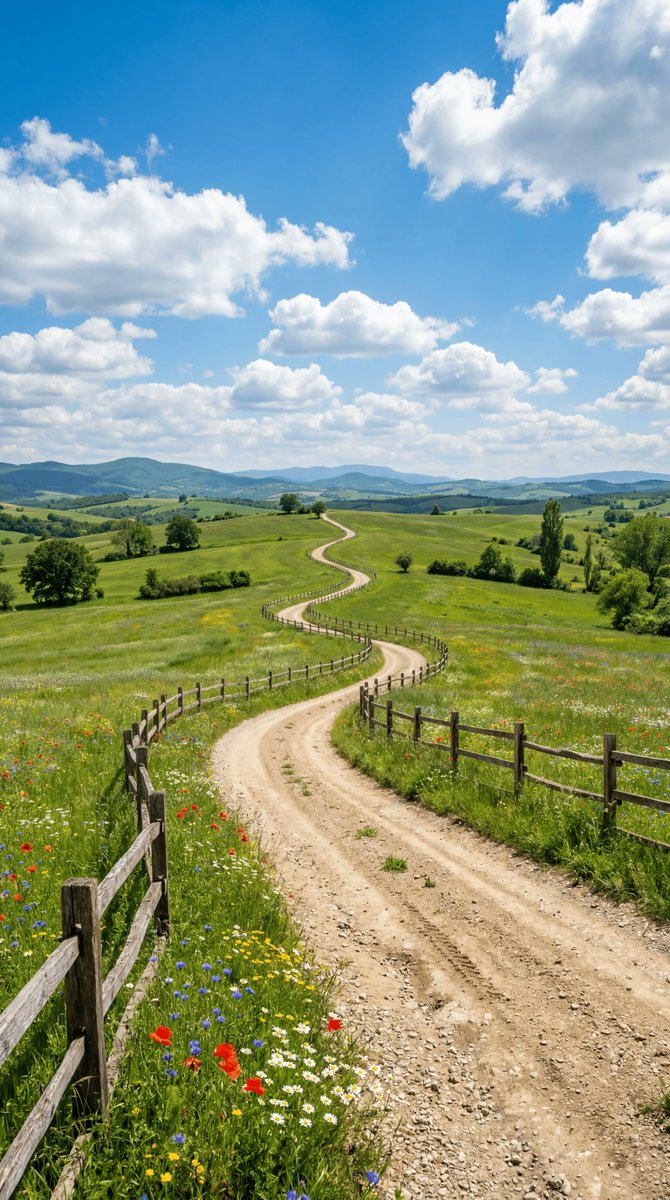 A detailed prompt for Nano Banana 2 to generate a wide-angle landscape photograph of a winding, sun-baked dirt road stretching towards the horizon. The scene includes lush green pastures, vibrant wildflowers, rolling hills, and a cerulean sky, specified with technical cinematography details (24mm lens, deep depth of field) and a National Geographic style.