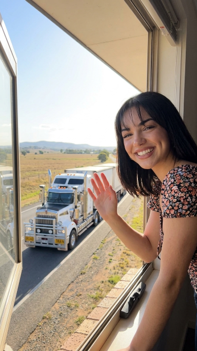"scene": "A young woman leaning out of an open window, smiling brightly and waving at a large white semi-truck passing by on a rural highway.",